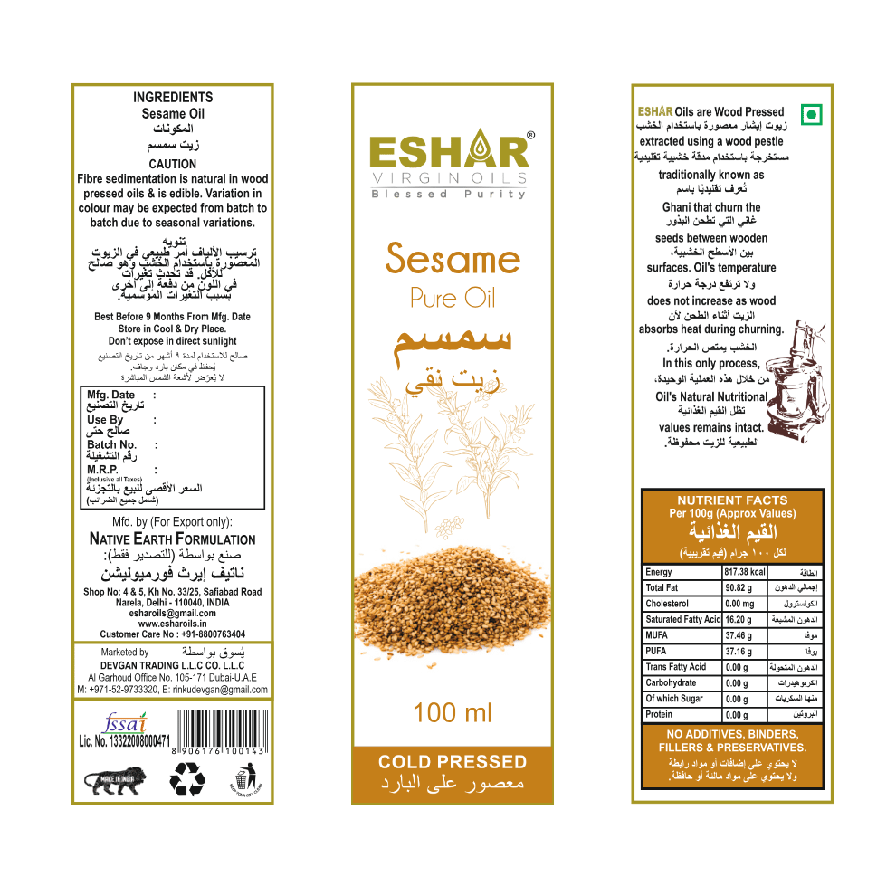 Eshar Oils proudly presents its Sesame Oil, a testament to purity, quality, and the richness of nature’s bounty. Made from premium sesame seeds and cold-pressed with precision, our oil preserves the natural essence of sesame, delivering unparalleled flavor and a multitude of health benefits.